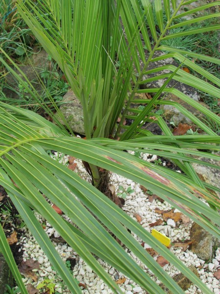 Terre acide tu es sur? Si ton sol est neutre c'est le mieux je pense pour ce palmier. Allège en ajoutant du sable à ta terre