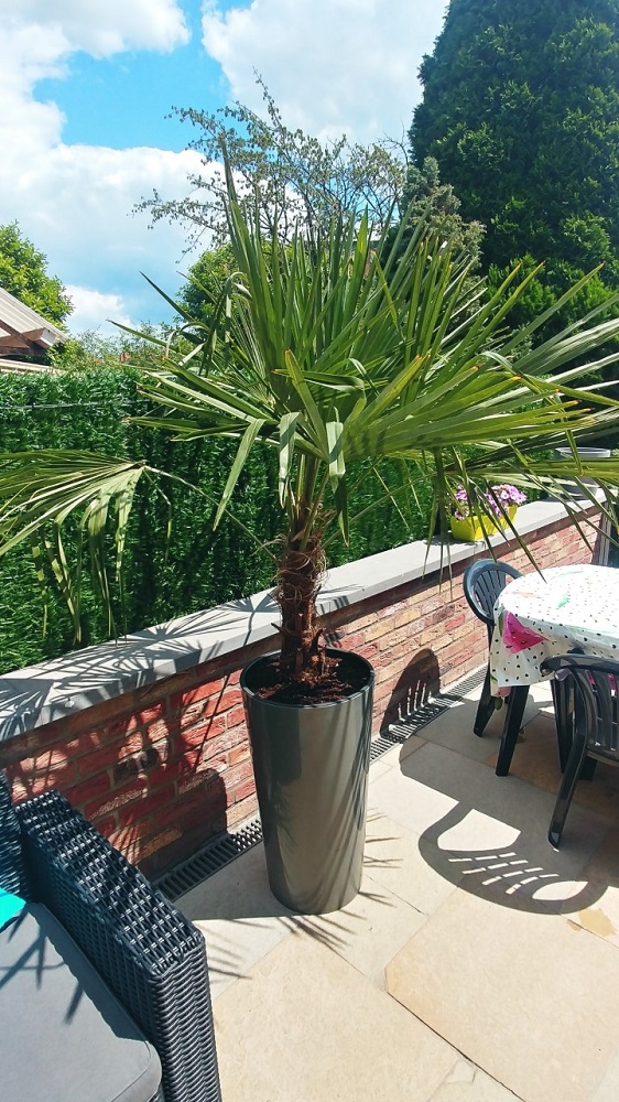J'ai acheté un trachycarpus fortunei que j'ai replanté chez moi dans un pot un rien plus grand. J'ai placé des billes d'argile au fond et j'ai utilisé un terreau universel :