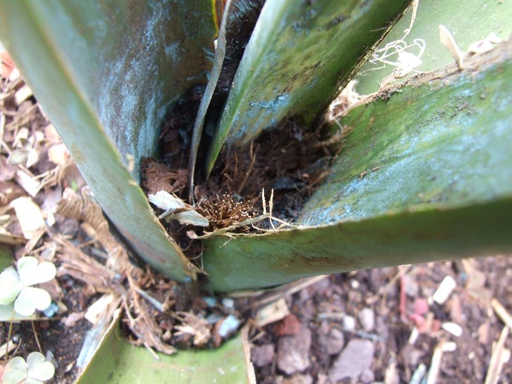 je le disais dans le post sur mon jardin mais mon sabal bermudana a très mal vécu la fin de l'hiver, ou alors il a eu un problème je n'en sais rien, mais je poste les photos ici du coeur juste pour savoir s'il y a une chance qu'il reparte ou je peux le bazarder... les cloportes n'ont pas cessé d'attaquer le coeur.. j'y avais mis de la cannelle il y a quelques mois, puis de la bouillie bordelaise d'où la couleur bleue.