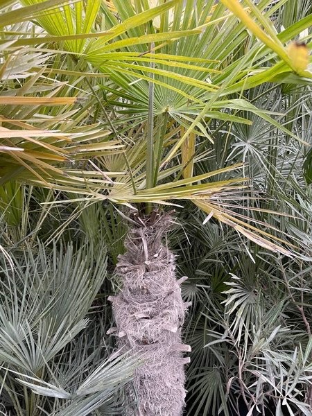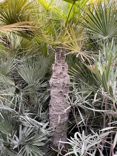 Je me baladais en pépinière lorsqu’un « Chamaerops » a attiré toute mon attention… sa couleur, plutôt pâle et qui tire vers le blanc, monocaule, alors qu’un sujet strictement identique, à côté, était bien cespieux et produit de nombreux rejets.