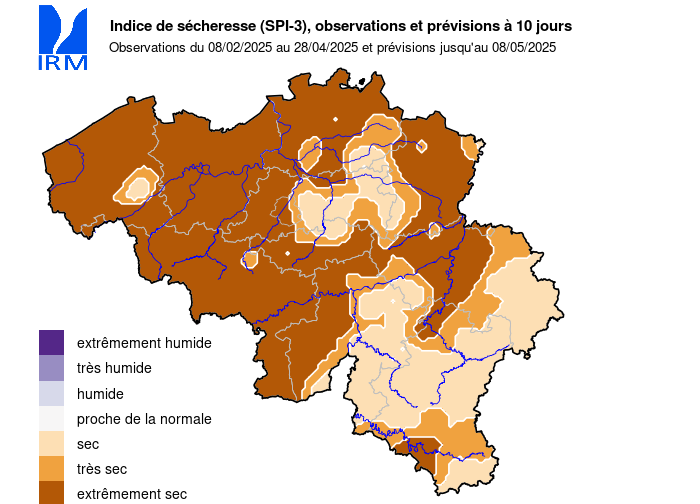 Côté sécheresse ça dépend du coin où l'on se situe dans le pays, mais globalement on est à minima entre du sec et de l'extrêmement sec. Et pour les 10 prochains jours on tombe vraiment dans l'extrême sur les 3/4 du pays...